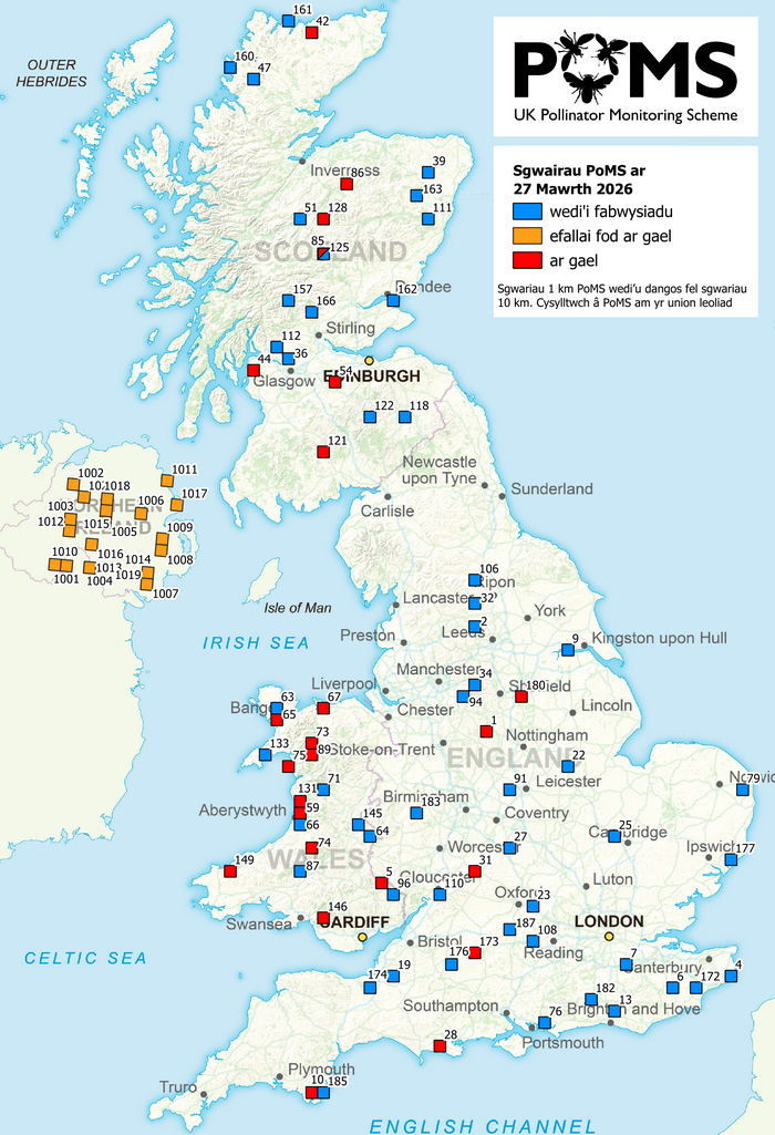 Mae'r arolygon 1 km sgwâr yn dilyn dull systematig, gan ddefnyddio trapiau padell i ddal samplau o bryfed o set o 75 o sgwariau 1 km ar draws y DU (gweler y map o'r lleoliadau). Sefydlwyd y rhwydwaith o leoliadau gan PoMS gyda chaniatâd hael y perchenogion tir sy'n cymryd rhan. Caiff y gwaith samplu pryfed a monitro blodau ei wneud gan ein tîm rhagorol o wirfoddolwyr sydd wedi 'mabwysiadu' y sgwariau ac sy'n helpu i gynnal yr arolygon. Mae pob sgwâr yn cael ymweliad bedair gwaith y flwyddyn, unwaith ym mis Mai, Mehefin, Gorffennaf ac Awst.