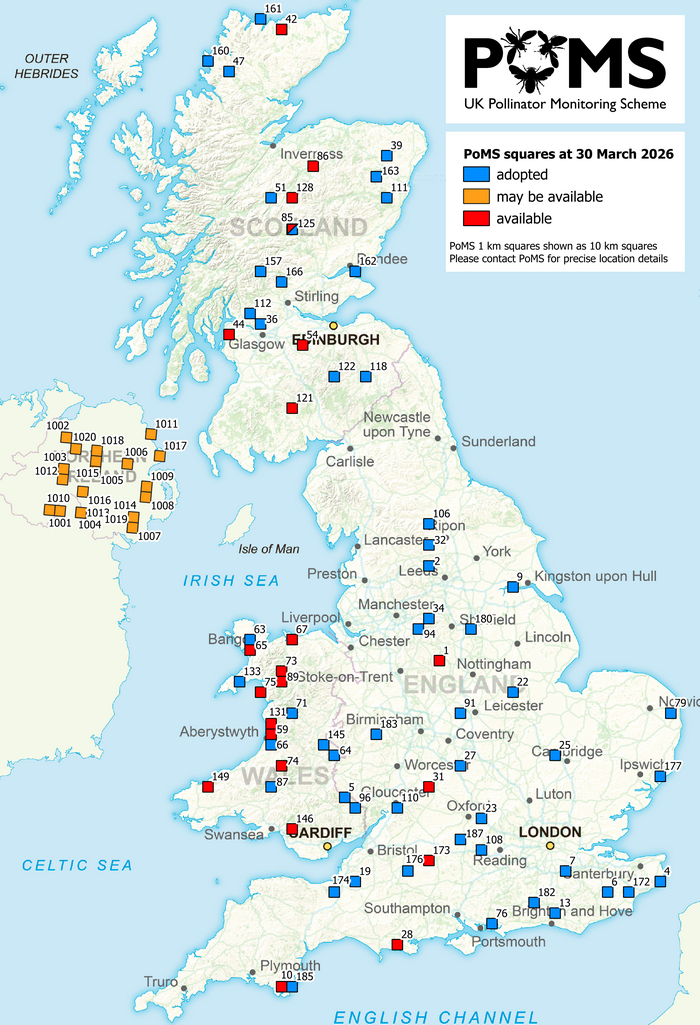 If you live near one of the unadopted (red) squares and would be interested in taking part please contact PoMS for England, Scotland and Wales, or contact DAERA for Northern Ireland. Or if you are interested in one of the "awaiting confirmation" (orange)  squares please let us know and we will update if they become available.